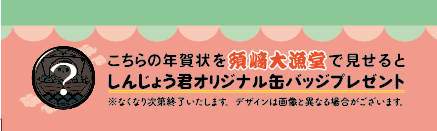 な!なんと!しんじょう君からのお返事年賀はがきを須﨑大漁堂で見せると、しんじょう君缶バッヂをプレゼントしてくれるのです!!