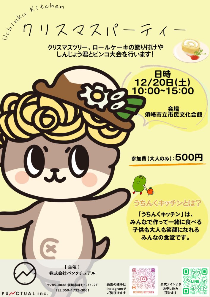 HOME > > 子ども食堂「うちんくキッチン」 2025.12.15 開催日: 2025.12.20 13:00 - 14:00カテゴリー: イベント うちんくキッチン2025年12月20日 ( 土曜日)須崎市立市民文化会館 しんじょう君は13時00分 ~ 14時00分のどこか30分程度出て、ビンゴ大会の抽選 及び 景品渡しの手伝いをします。 くわしくはこちら