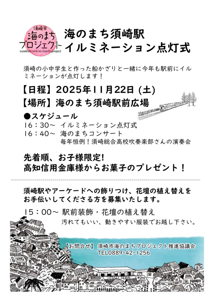 HOME > > 海のまち須崎駅イルミネーション点灯式 2025.11.20 開催日: 2025.11.22 16:30 - 17:00カテゴリー: イベント 海のまち須崎駅イルミネーション点灯式 16:30~17:00 須崎駅前広場 高知県須崎市原町1丁目10−13 16:41 イルミネーション点灯
