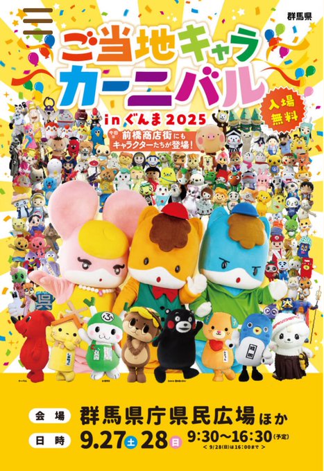 HOME > > ご当地キャラカーニバルinぐんま 2025.06.25 開催日: 2025.09.27 09:30 - 2025.09.28 16:30カテゴリー: イベント ご当地キャラカーニバルinぐんま 2025年9月27日(土曜日)~9月28日(日曜日)雨天決行・荒天中止 群馬県庁 県民広場ほか(〒371-8570 前橋市大手町一丁目1番1号)